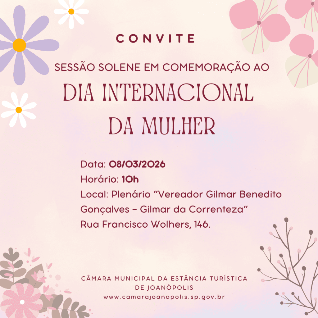 A Câmara Municipal da Estância Turística de Joanópolis tem a honra de convidar toda a comunidade para a Sessão Solene em comemoração ao Dia Internacional da Mulher. O evento está agendado para o dia 08 de março de 2025, às 10h, e terá como palco o Plenário “Vereador Gilmar Benedito Gonçalves – Vereador Gilmar da Correnteza”. Na ocasião, os parlamentares da Casa prestarão homenagens a cidadãs que, por meio de suas trajetórias, representam a força e a relevância de todas as mulheres da nossa sociedade.